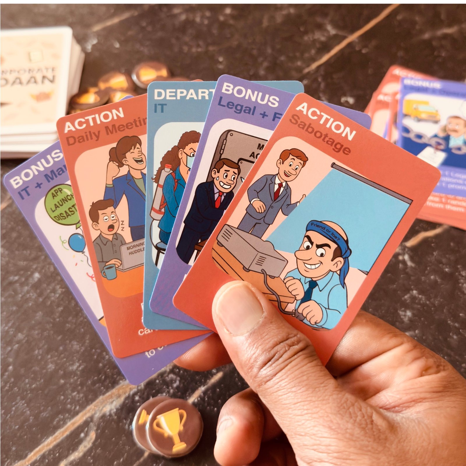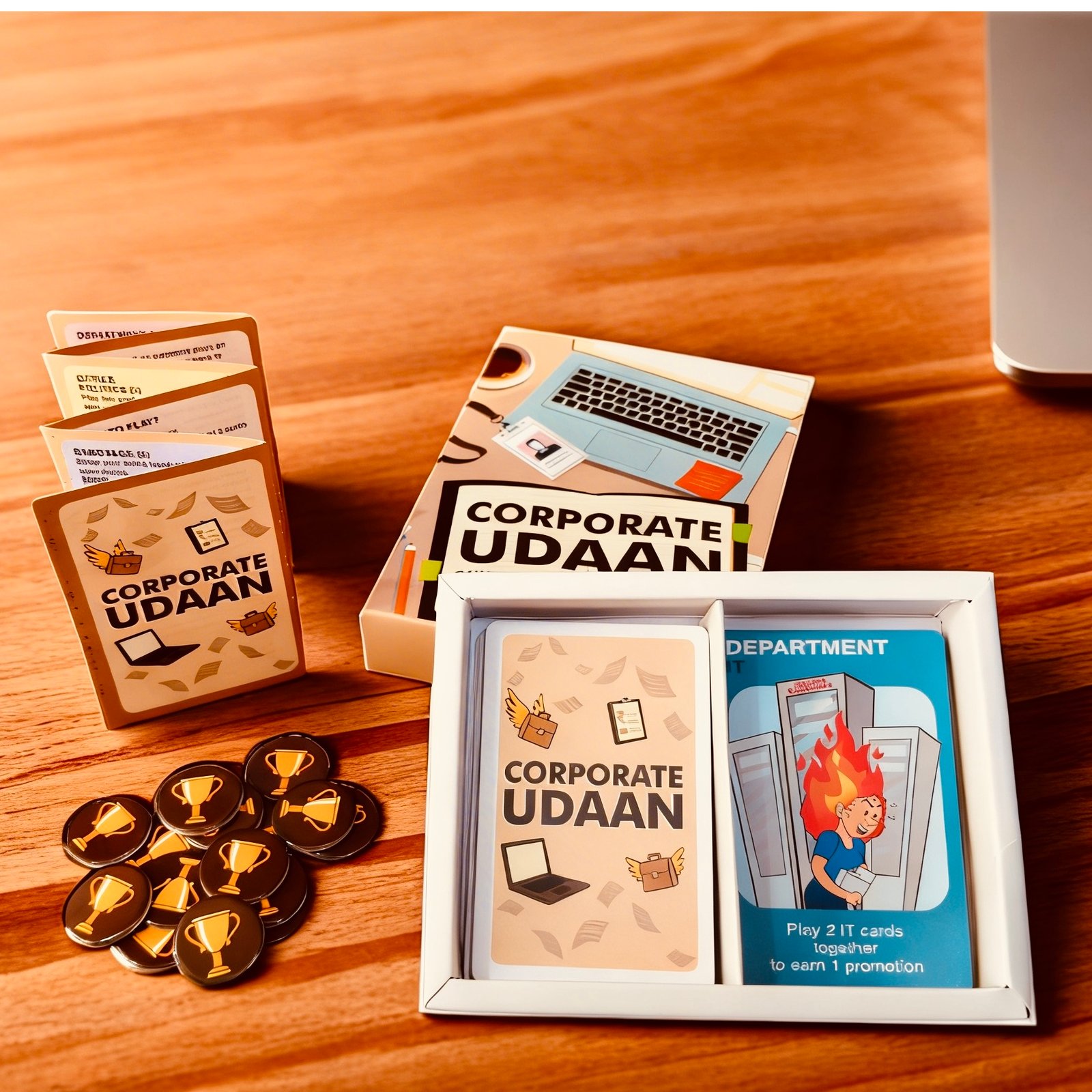 Take flight into the quirky world of boardrooms, deadlines, and office drama! Corporate Udaan is a fun and strategic card game that transforms everyday workplace chaos into an exciting challenge. Build your path to success by collecting opportunities, dodging setbacks, and navigating surprise events — all while competing with your colleagues to reach the ultimate milestone first.